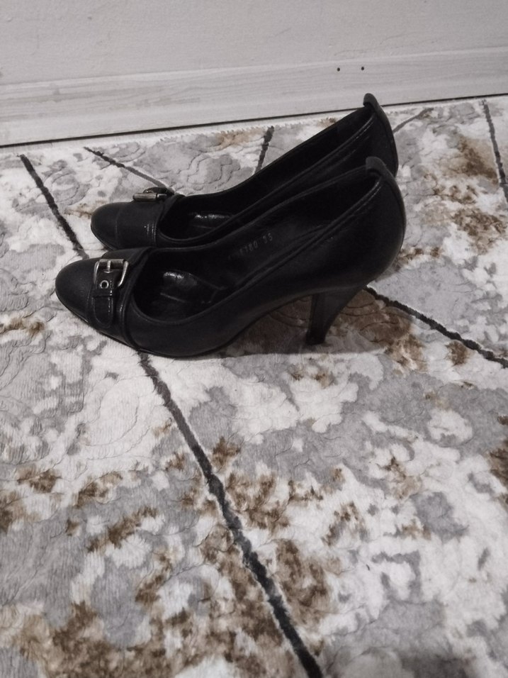 Klasik şıklık sunan siyah, tokalı ve yüksek topuklu stiletto. Kauçuk benzeri malzemeden üretilmiş, desen içermeyen ofis ayakkabısı.