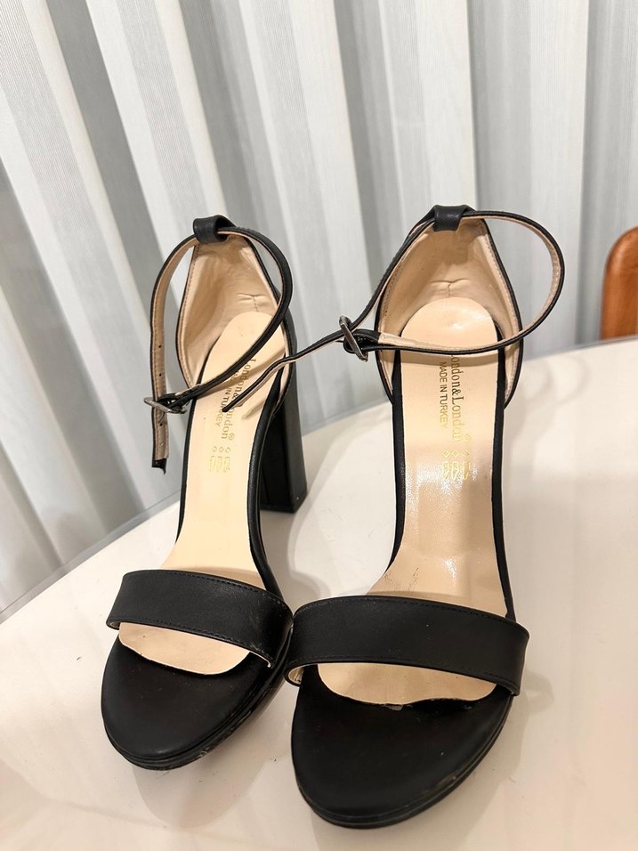 Kauçuk malzemeden yapılmış, tokalı bilek kayışı ve yılan derisi desenli siyah stiletto topuklu ayakkabılar, ofis kullanımı için uygundur.