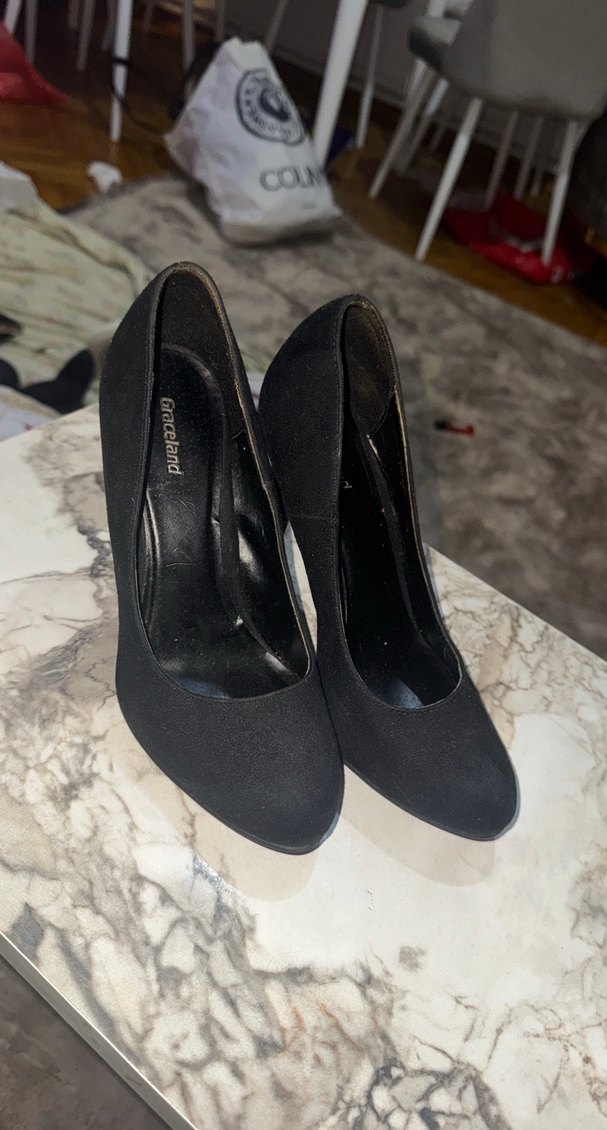 Klasik siyah topuklu ayakkabılar, tokalı detaylı, ofis kullanımı için uygun gotik tarzda. Dayanıklı kauçuk malzemeden üretilmiştir.
