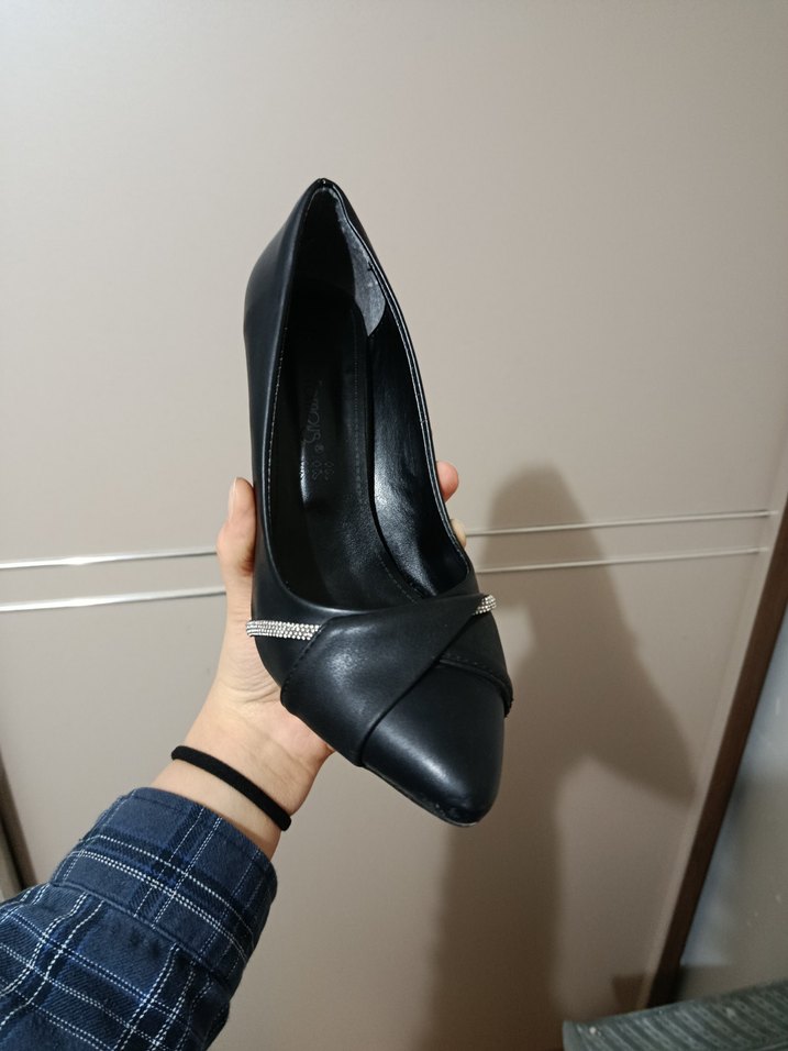 Klasik siyah topuklu kadın ayakkabı, tokalı detay ve hafif yılan deseniyle ofis için uygun goth Paris tarzını yansıtıyor.