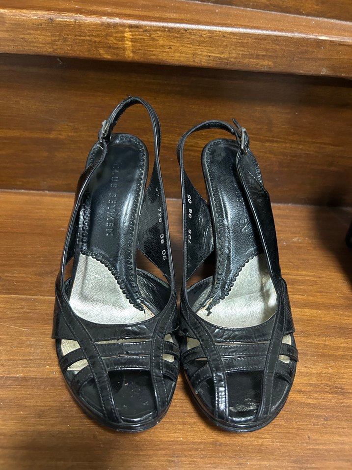 Siyah dolgu topuklu, tokalı kadın akşam ayakkabısı. Kauçuk malzemeden üretilmiş, desen içermeyen vintage gotik tarz. Ofis kullanımı için uygun. 36 numaradır .