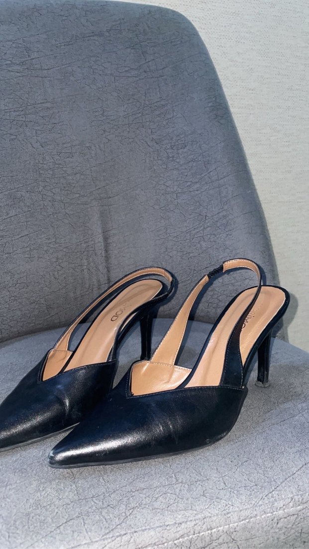 Siyah stiletto topuklu, tokalı kayışlı ve dayanıklı kauçuk malzemeden yapılmış. Minimalist, çağdaş tasarımıyla ofis için uygun.