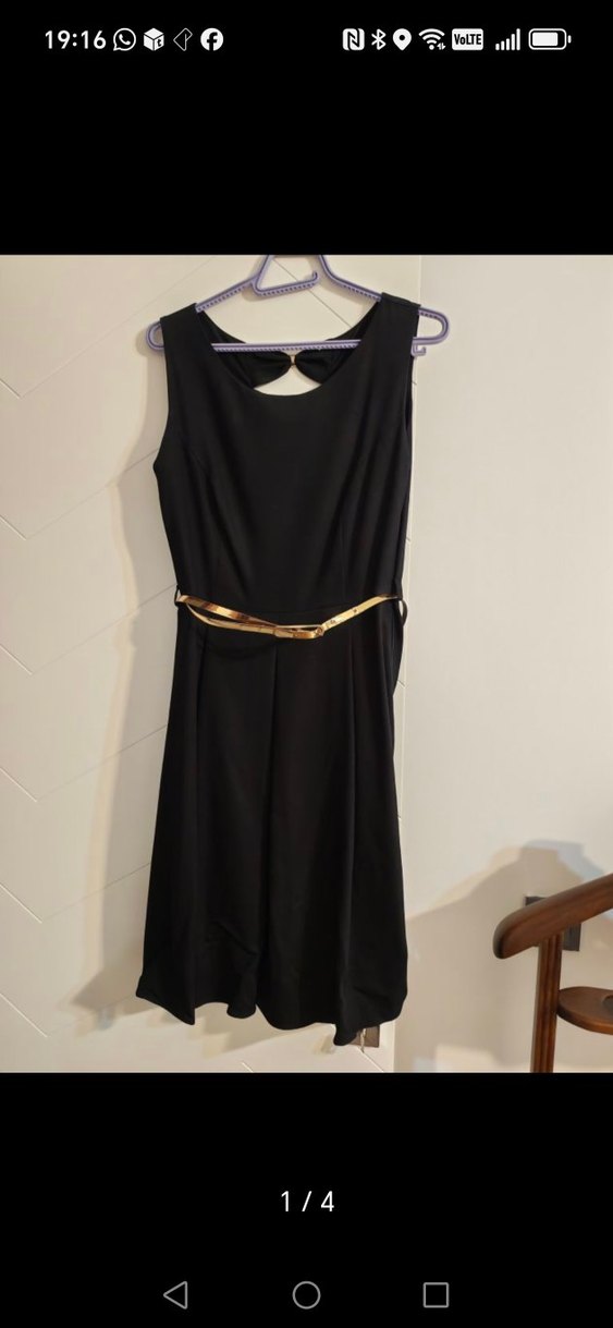 Klasik zarafette, yuvarlak yakalı, kolsuz ve oturan kesim siyah uzun elbise, altın kemer detayına sahip, minimalist gotik tarzda. Sırtında fiyonklar var