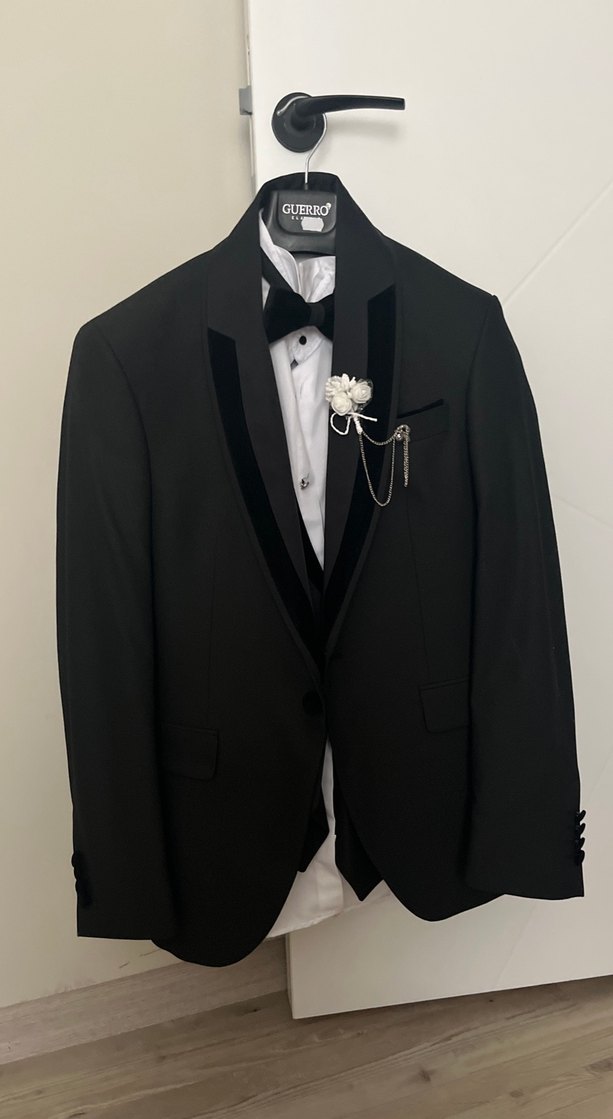 Siyah yakalı yelek, beyaz düğmeli gömlek ve siyah papyon ile kombinlenmiş. Klasik ve gotik tarz için uygundur. 1 kere kullanılmıştır.