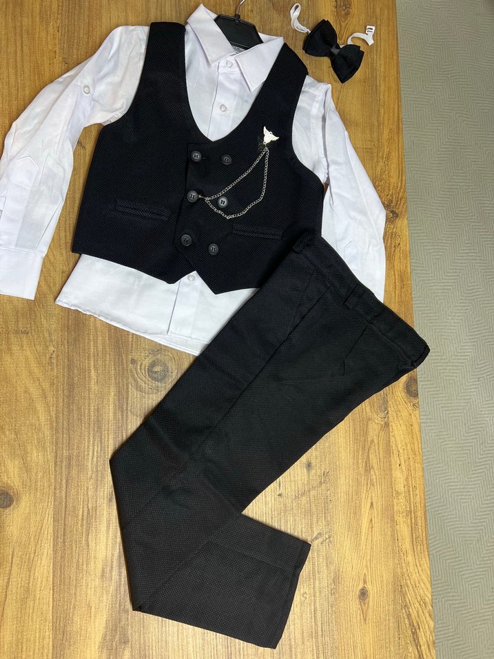 Kolsuz siyah yelek, düğmeli ve kesimli yakalı, siyah pantolon ve beyaz gömlekle tamamlanmıştır. Klasik şıklık için küçük papyon ve zincir aksesuarı içerir.