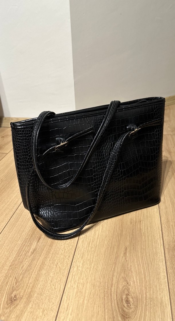 Koyu yılan derisi desenli siyah deri çanta, tokalı detaylarıyla çağdaş ve klasik şıklığı bir araya getirir. Günlük kullanım için uygundur.