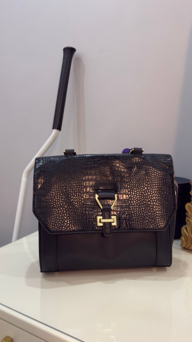 Klasik zarafeti goth stiliyle birleştiren, siyah yılan derisi desenli, tokalı deri çanta. Ofis kullanımı için uygundur.