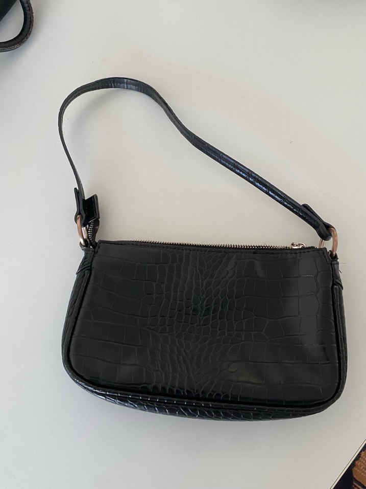 Siyah yılan derisi desenli deri çanta, fermuarlı kapama ve sokak stiliyle günlük kullanıma uygun klasik şıklık sunar.