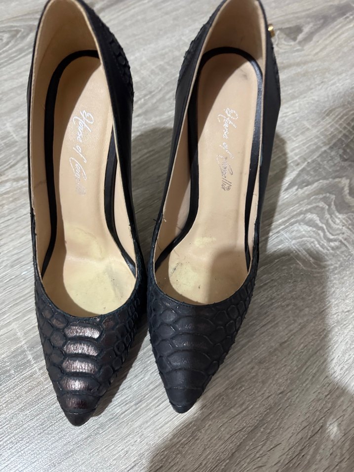 Siyah deri stilettolar yılan derisi desenli ve tokalı detaylıdır, klasik zarafet ile gotik tarzı birleştirir. Romantik akşamlar için uygundur.