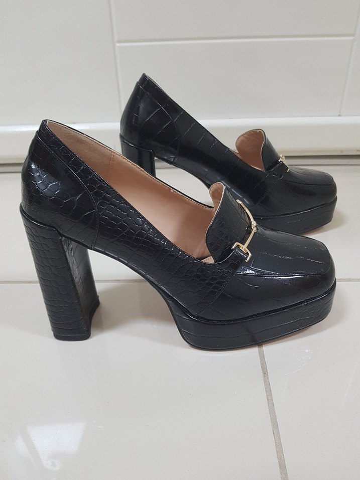 Siyah yılan derisi desenli, tokalı platform topuklu ayakkabı. Kauçuk tabanlı, ofis için goth tarzda şık bir seçenek.