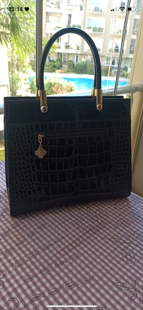 Parlak yılan desenli siyah deri çanta, tokalı saplarıyla modern klasik stil ve günlük kullanım için uygundur.