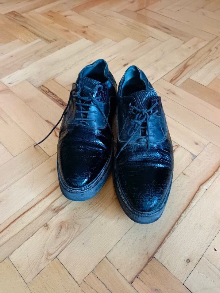 Klasik siyah erkek ayakkabılar, yılan desenli ve tokalı detaylara sahiptir. Kauçuk malzemeden yapılmış, günlük kullanıma uygundur. bazı yerlerinde renk değişikliği var boyayla hal olur mu bilmiyorum küçük geldiği için uğraşmadım