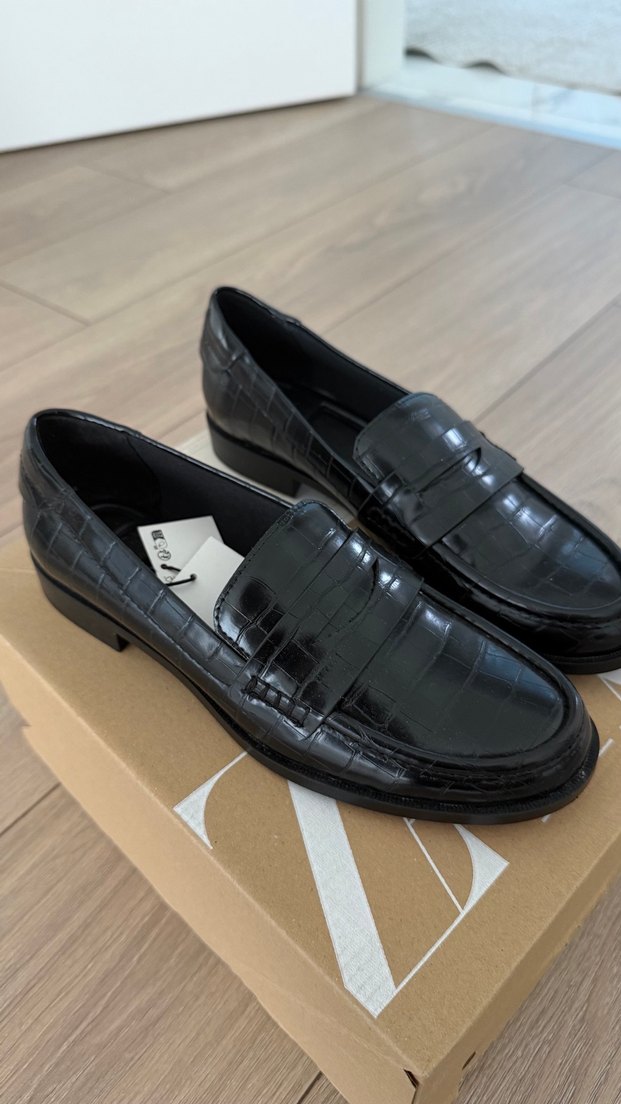 Siyah yılan desenli, tokalı ve blok topuklu kauçuk kadın loafer, ofis ve günlük kullanıma uygundur. Yeni etiketli zara