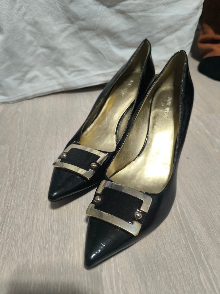 Siyah yılan desenli stilettolar, önünde tokalı detay ve kauçuk tabanlı, klasik gotik ofis tarzı için sivri burunlu. Nine West 40 numara