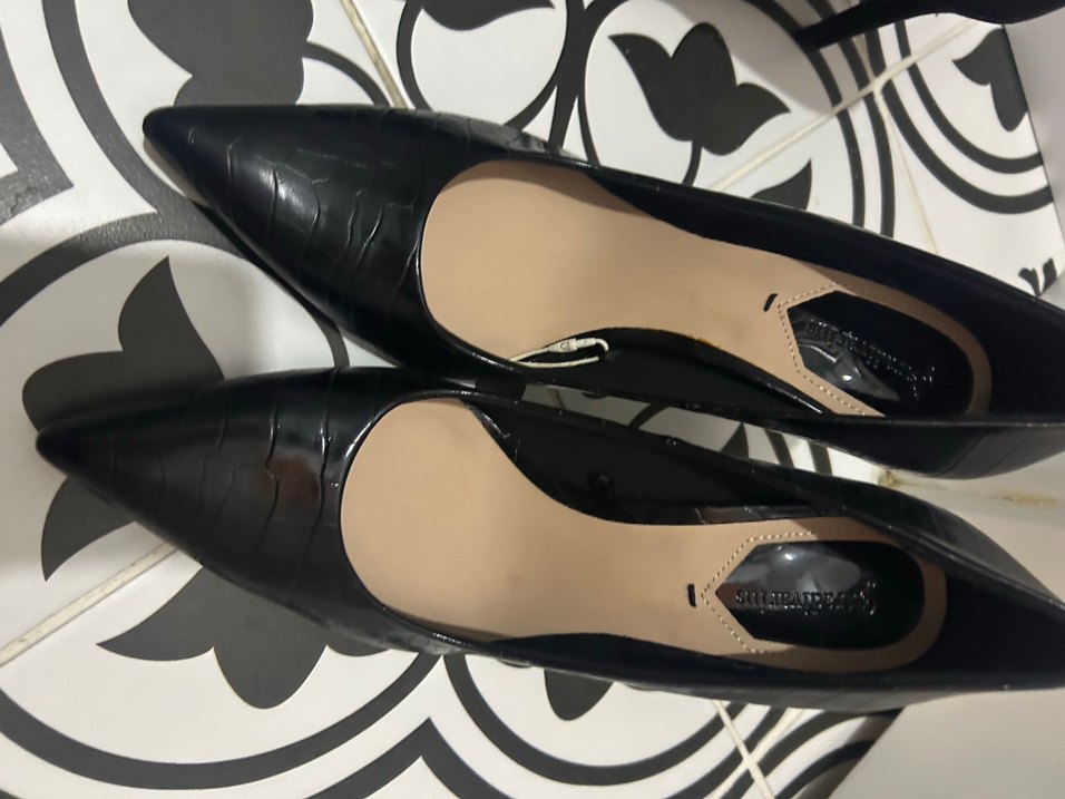 Ofis için uygun, yılan desenli siyah stiletto topuklu, tokalı ve gotik tarzda klasik şıklık sunar.