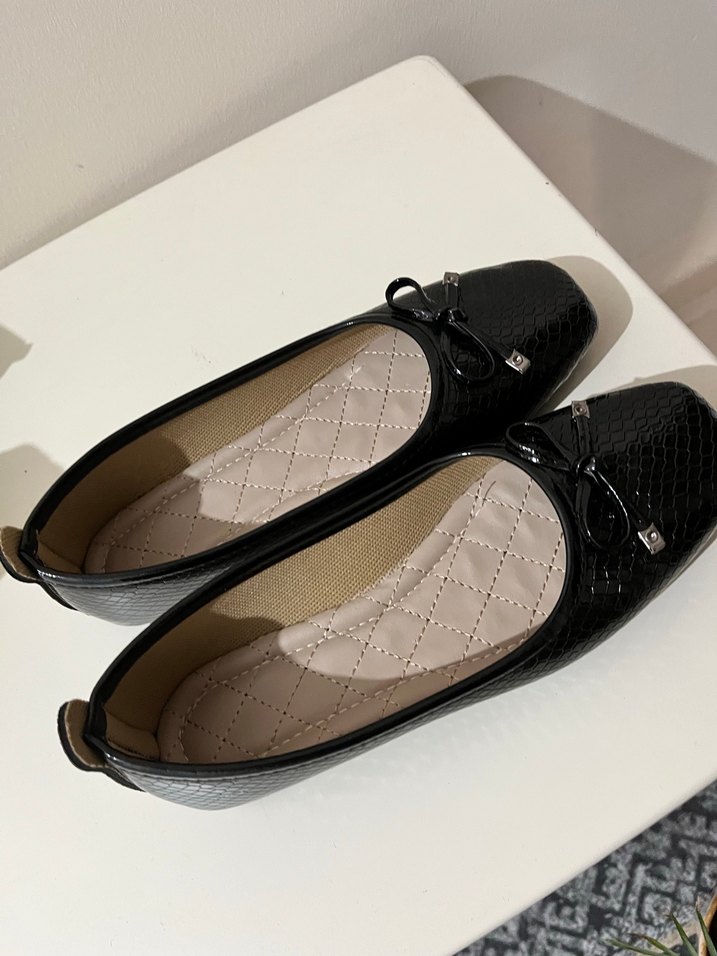 Siyah yılan desenli, tokalı ve blok topuklu kauçuk malzemeden yapılmış modern klasik tarzda babetler. Günlük kullanım için uygundur. 1 defa kullanıldı