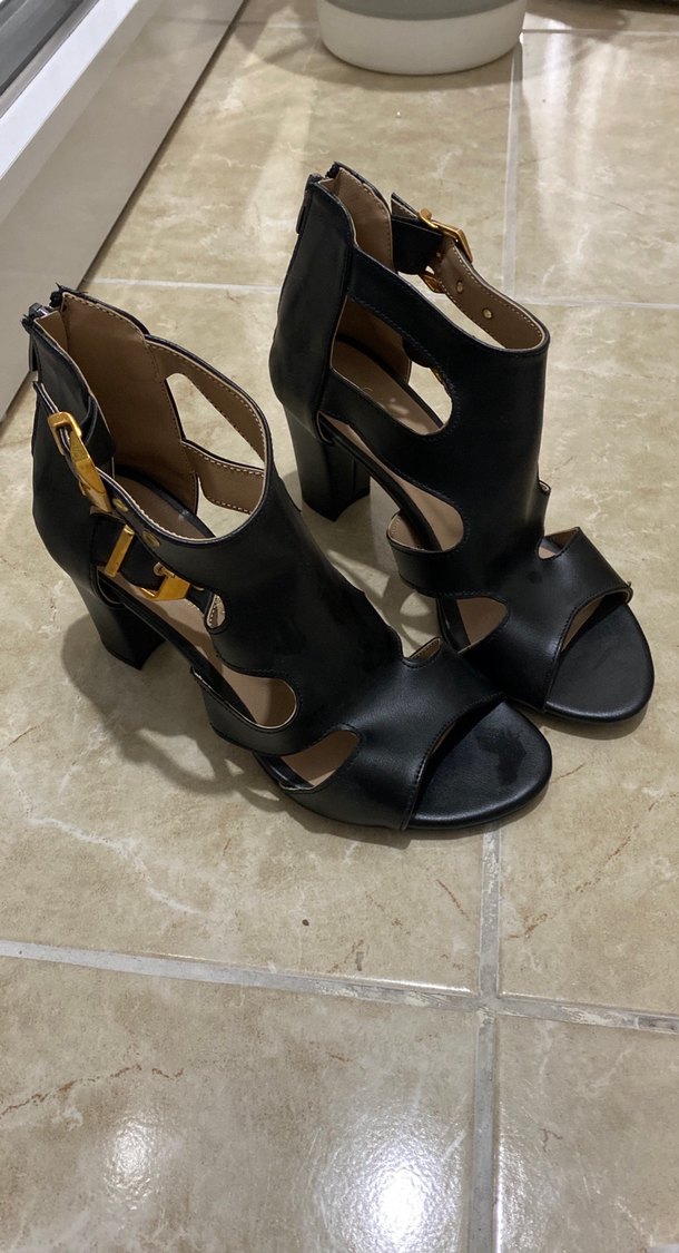 Siyah yılan desenli kadın sandaletleri, kalın topuklu ve tokalı kayışlı. Dayanıklı kauçuk malzemeden, romantik akşamlar için uygun.