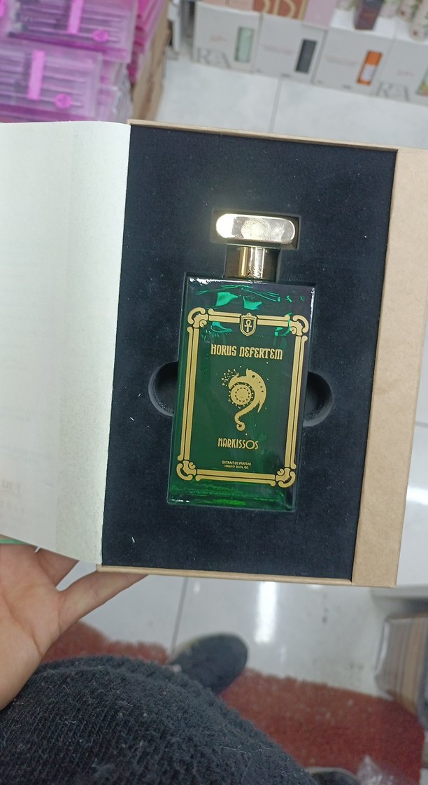Koyu yeşil şişe ve altın detaylarla klasik ve karşı kültür tarzında erkek parfümü. Üzerinde 'Horus Defertem' ve 'Nornisos' yazıyor.