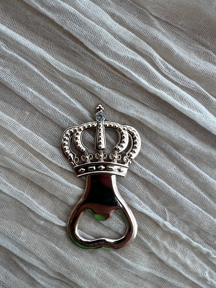 Klasik tarzda, parlak metalden yapılmış taç figürlü ve şişe açacağı olarak da kullanılan beyaz rozet.