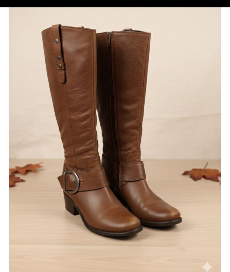 Parlak kahverengi deri dizüstü bot, kalın topuklu ve tokalı detaylara sahip, şık ve rahat kullanıma uygun.