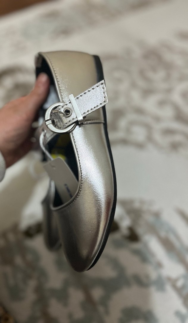 Tokalı metal detaylı, modern klasik tarzda beyaz kız babet ayakkabılar, desensiz ve gri parlak yüzeye sahiptir. Daha sıfır etiketi uzerınde