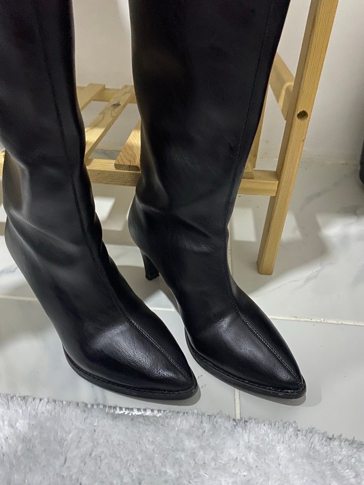 Siyah deri dizüstü çizme, 2025 kasım ayında aldım 5 kere falan giymişimdir cok zarif duruyor. Topuk bıyundan dolayı her yere uyum sağlayabilir,rahat kullanabilir. Üç kısmı yün peluş gibi sıcak tutuyor. Rahat kullandım