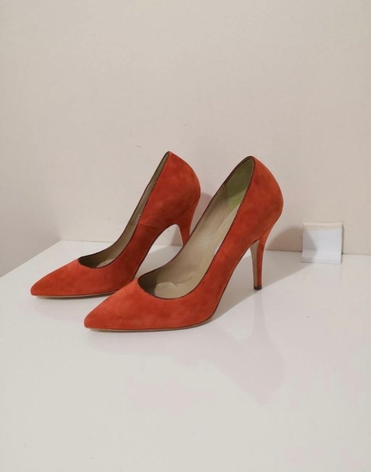 Kullanılmamış 0 etiketli kutulu..gerçek deri süettir..topuk boyu 10 cm dir..Turuncu süet stiletto topuklu, minimalist ve şık tasarıma sahip. Sivri burunlu ve yüksek topuklu, romantik akşamlar için uygun, zahmetsiz şıklık sunar.