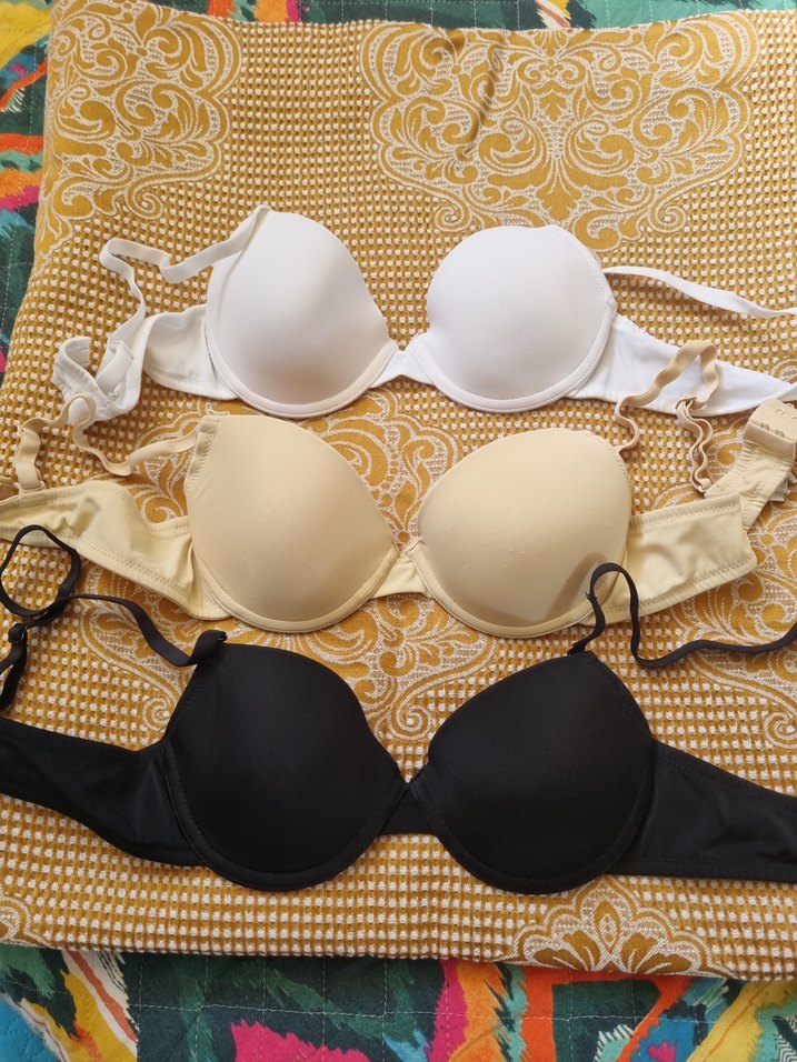 Beyaz, bej ve siyah renklerde, desen içermeyen klasik sütyen seti. Normal uzunlukta askılar ve destekli yapıya sahip. Beden olarak 75A Beden, birer defa giyildi. Herhangi bir deformesi yoktur. Adet fiyatı 250 tl dir.