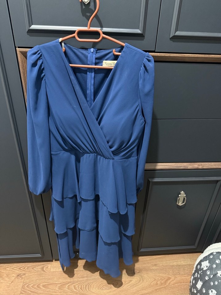 Klasik zarafeti yansıtan, V yakalı, uzun kollu ve pileli katmanlı indigo midi elbise. Nişanda giymiştim, 42 beden eteğinin arkasında sağ altta bir yerde ip takıldı onun dışında defosuz ( zaten bir kere giydim )