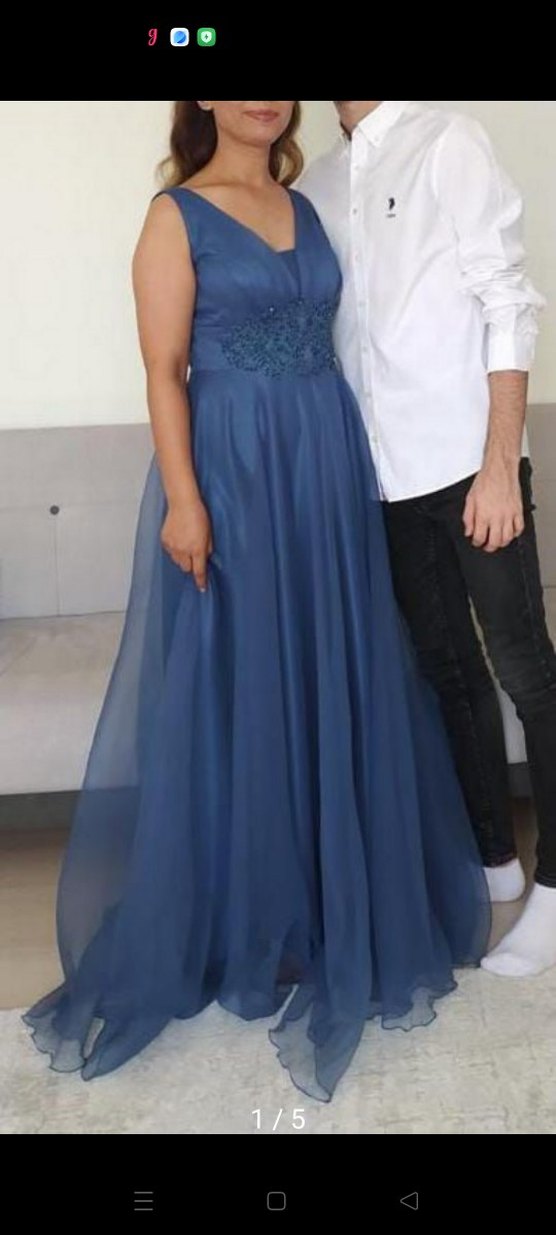 Klasik V Yaka Mavi Uzun Abiye Elbise