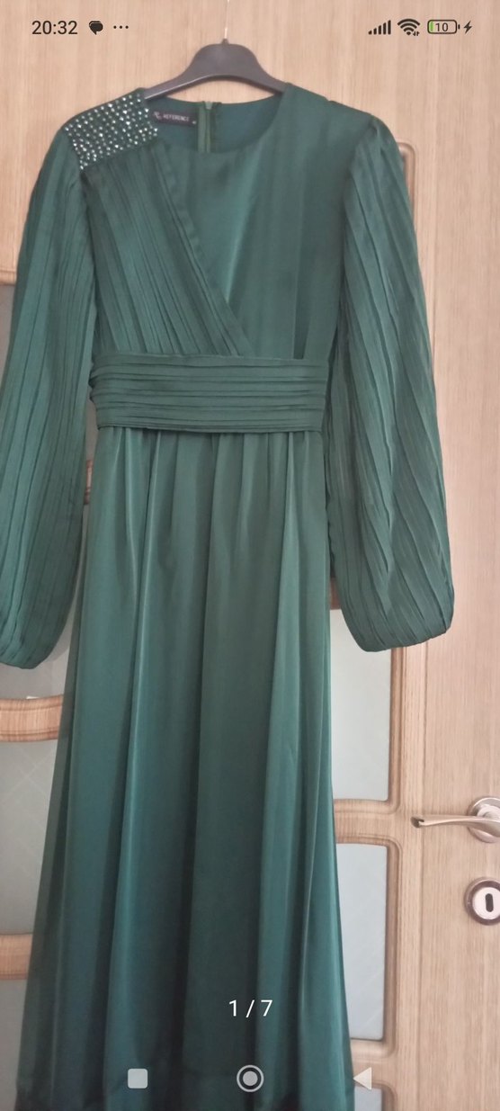 Koyu yeşil uzun elbise, pileli uzun kollu ve V yakaya sahiptir. Rahat kesim, pileli bel detayı ve yumuşak sentetik kumaştan yapılmıştır, düğünler için uygundur.