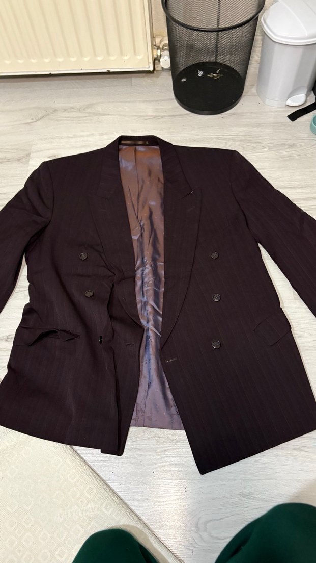 Koyu kahverengi erkek takım ceketi, kesik yakalı ve düğmeli ön detaylıdır. Normal uzunlukta, uzun kollu ve klasik şıklıkta, ofis için uygundur.