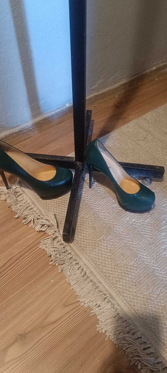 Koyu yeşil yılan derisi desenli, tokalı ve kauçuk malzemeden platform topuklu stiletto. Romantik akşamlar için uygun.