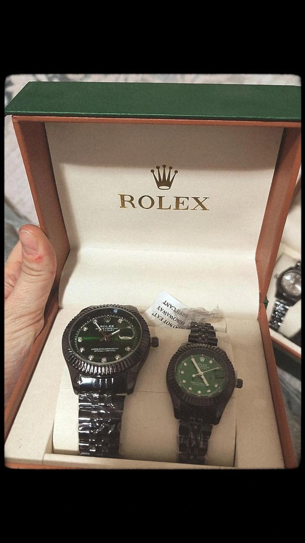 Klasik tasarıma sahip, koyu yeşil kadranlı ve metal kayışlı iki adet erkek Rolex saati, rock punk tarzıyla kutuda sunuluyor. ⌚