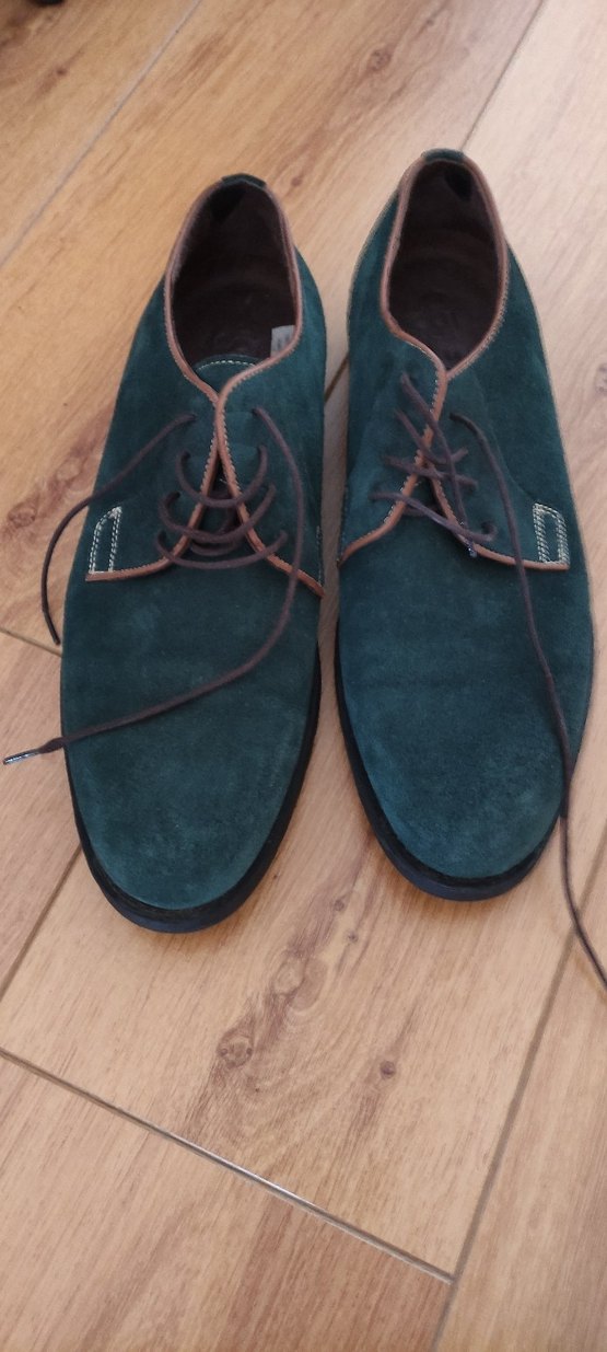 Koyu yeşil süet malzemeden yapılmış, tokalı klasik erkek ayakkabısı. Günlük kullanıma uygun, desen içermeyen geleneksel tasarım.