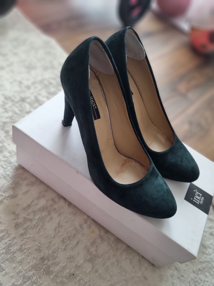 Koyu yeşil süet stiletto topuklu ayakkabılar, modern klasik tasarıma sahip olup ofis kullanımı için zahmetsiz şıklık sunar. Desensiz ve pürüzsüz bir görünüme sahiptir.