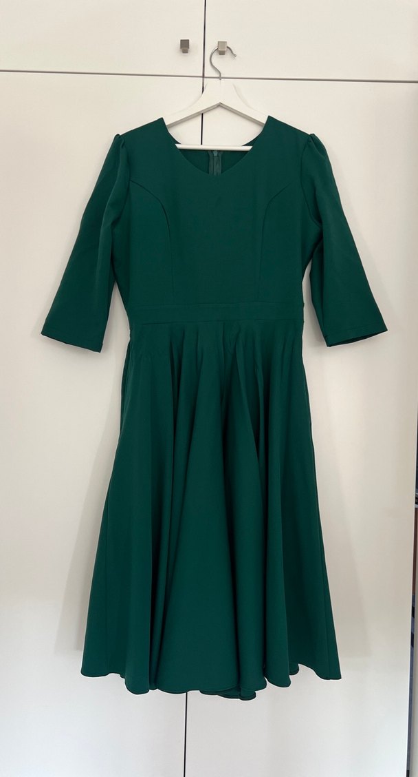 Koyu yeşil uzun elbise, yarı uzun kollu , pilili etek ve regular kesimle modern klasik tarzda. Sentetik kumaştan, ofis kullanımı için uygun. Tesettüre uygun dizin biraz altında bitiyor