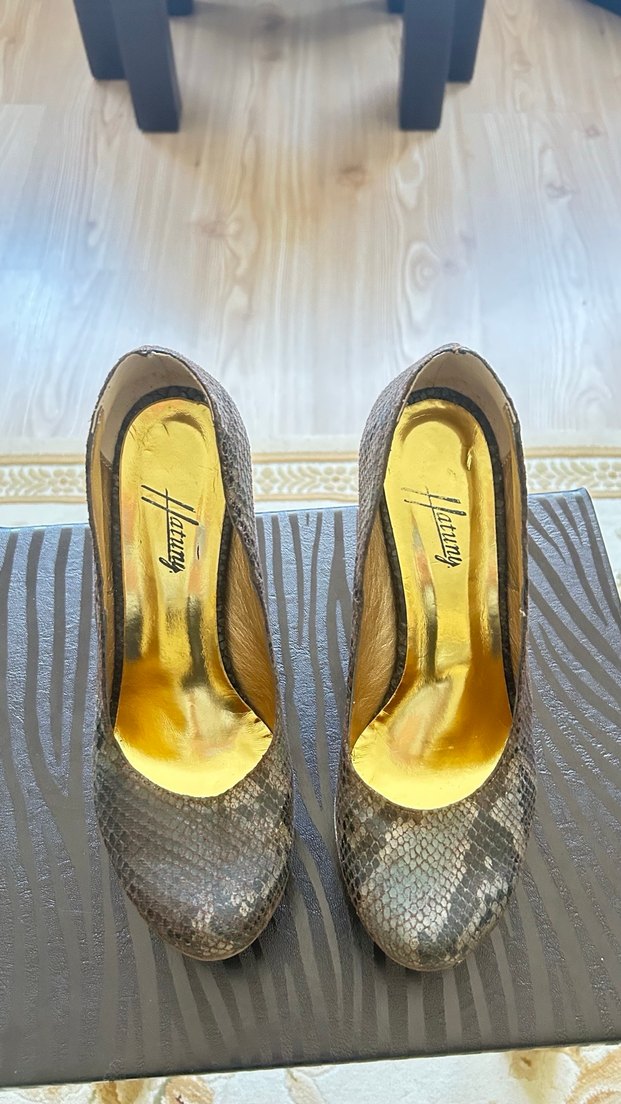 Kadınlar için yılan desenli topuklu ayakkabılar, toka detaylı ve altın iç yüzeylidir. Düğün ve klasik şıklık için uygundur.evde gitsim bir kez ama dolapta beklediğinden bazı yerlerde dökülmeler var 12punto topuk boyu