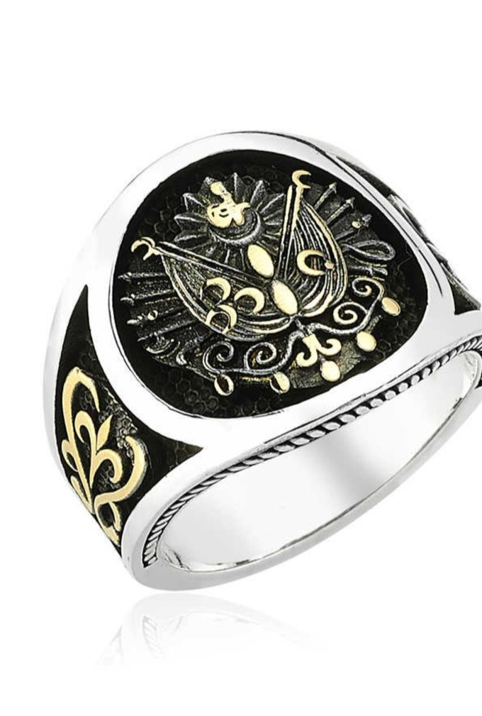 Bu erkek yüzüğü, siyah zemin üzerine parlak altın klasik motiflerle geleneksel zarafeti ve detaylı işçiliği bir araya getirir.