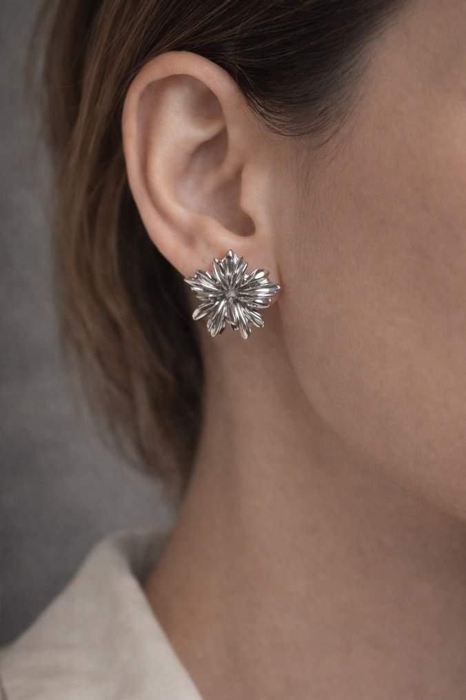 Gümüş tonlarında, pilili ve işlemeli çiçek desenli, çağdaş tarzda midi uzunlukta küpe. Romantik akşamlar için minimal bir dokunuş sunar.
