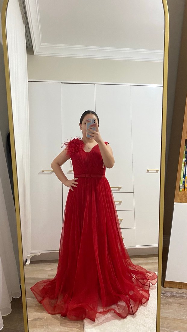 Sadece 1 kere giyildi kemeri de tüyü de isteğe göre çıkabiliyor göğüs dekoltesi vardı ben rahatsız olduğum için kapattırdım isteyen açtırıp kullanabilir boyum 1.50 9 cm topuklu ile giymiştim. Fiyatta yardımcı olurum