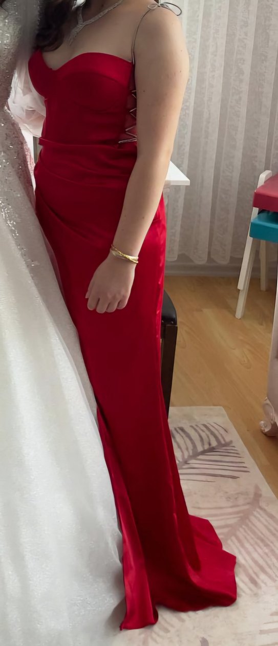 Bu kırmızı uzun abiye elbise, ince askılı ve drapeli tasarımıyla klasik zarafeti yansıtıyor. Parlak dokusu ve modern klasik stiliyle düğünler için uygundur.