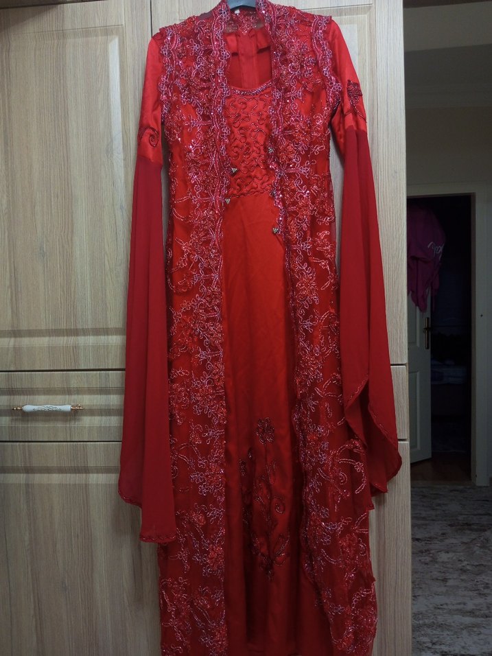 yenidir bir kez giyildi XS S M uyumludur Kırmızı uzun, bol kesim elbise, drapeli uzun kollu ve işlemeli desenlere sahip. Parlak yüzeyli, V yakalı, düğünler için gotik tarzda uygun.