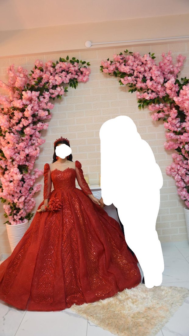 Uzun kollu, straplez yakalı, parlak desenli ve transparan detaylı kırmızı kına elbisesi, klasik ve gösterişli bir şıklık sunar. O kadar güzel bir elbise ki kendinizi içinde peri gibi hissediyorsunuz vücuda tam oturuyor. Taç ve küpe de dahil