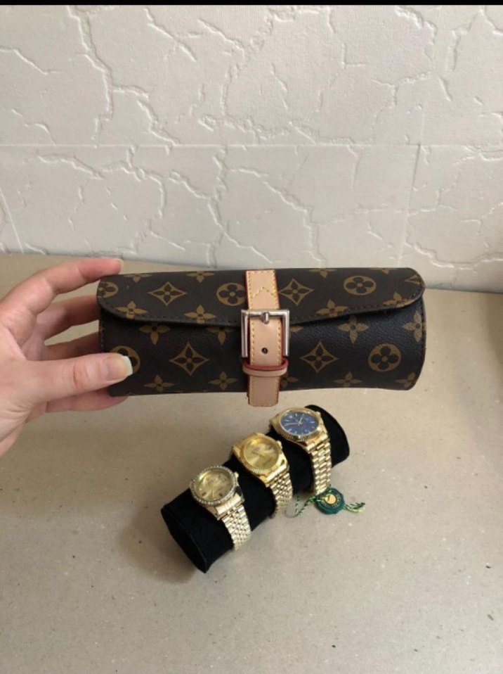 Altın tonlu üç kadın kol saati ve klasik Paris tarzı tokalı deri kutu seti. Zamansız zarafeti sevenler için ideal. ⌚ (saatler dahil değildir)