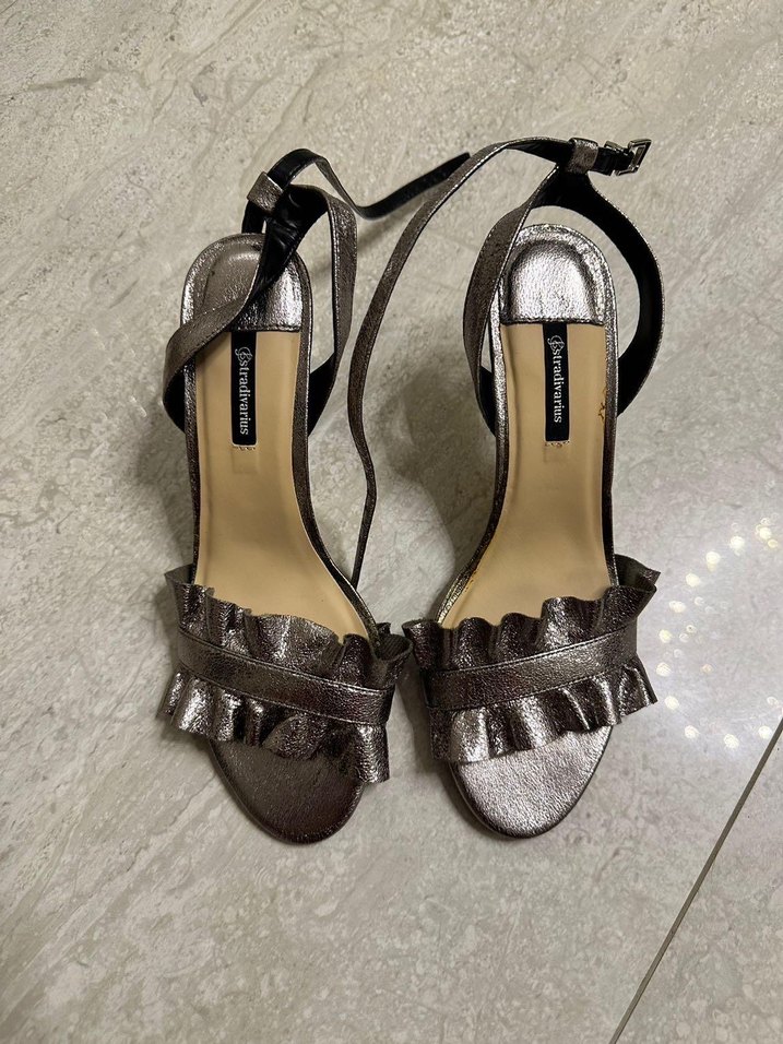Metal parlaklığa sahip, gümüş fırfırlı stiletto topuklu kadın ayakkabısı, düğün ve özel anlar için uygundur. 1 kez giyildi