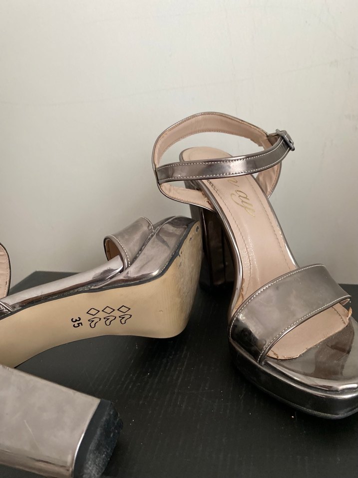 Gri platform topuklu ayakkabılar, metal görünümlü ve tokalı bantlıdır. Romantik akşamlar için klasik ve çağdaş bir şıklık sunar.