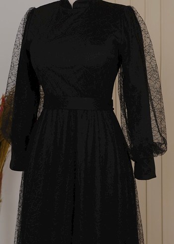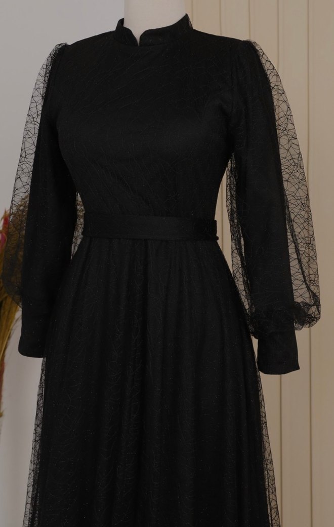 Bel detaylı, yüksek yakalı ve tül görünümlü siyah uzun elbise, klasik gotik tarzını yansıtıyor. Günlük kullanıma uygun şık bir model. 40 beden 38 bedene uyumlu