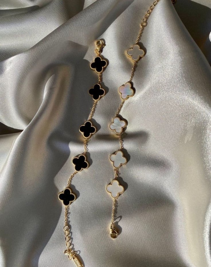 Klasik zarafeti yansıtan, zincir detaylı ve nakışlı yonca desenli altın bileklikler. Günlük kullanıma uygun, çağdaş Paris tarzı.
