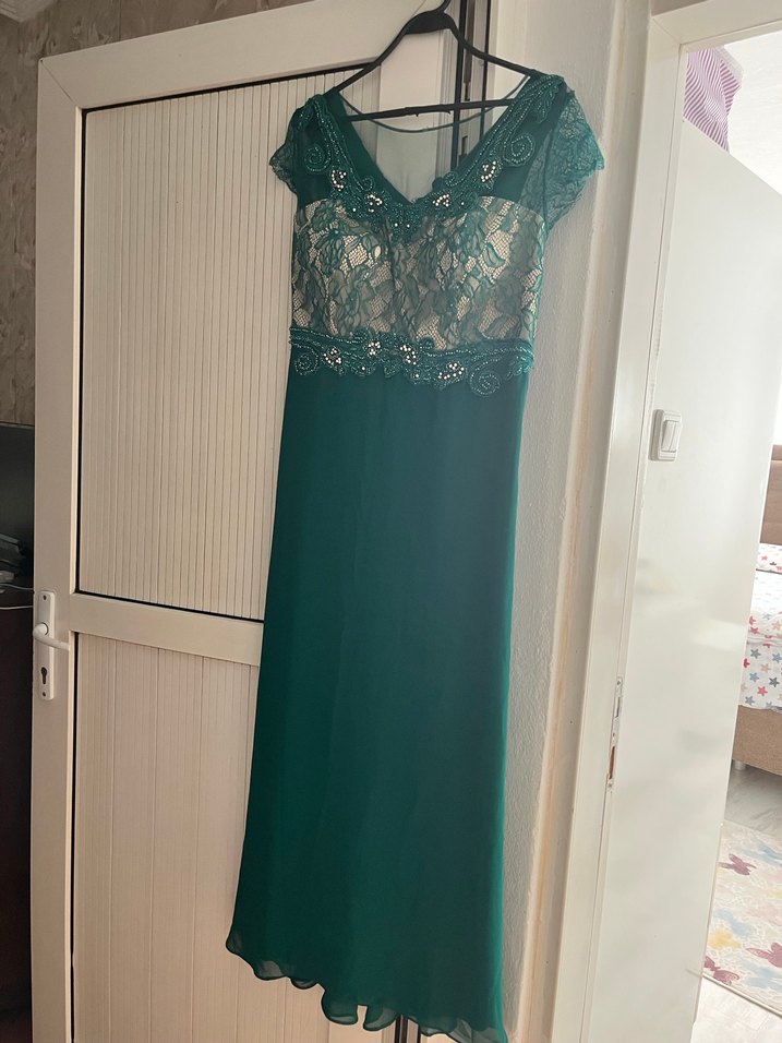 Uzun, v yaka ve dantel detaylı, dar kesim yeşil gece elbisesi. Kolsuz ve vintage tarzda, düğünler için uygun bir modeldir. Üzerinde boncuk detayları vardır ama arka süsleme kısmının bir kısmı kopmuştur silikon tabancasıyla yapıştırılabilir